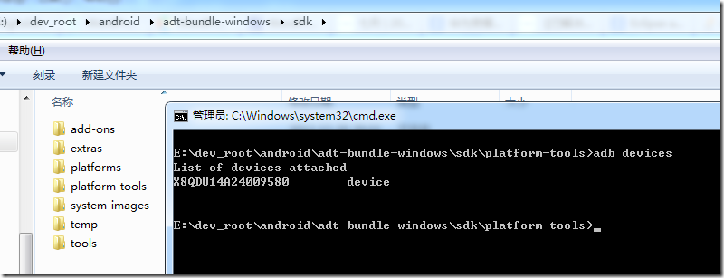 E:\dev_root\android\adt-bundle-windows\sdk\platform-tools>adb devices List of devices attached X8QDU14A24009580 device E:\dev_root\android\adt-bundle-windows\sdk\platform-tools>