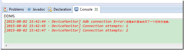 [2015-08-02 15:42:44 - DeviceMonitor] Adb connection Error:远程主机强迫关闭了一个现有的连接。 [2015-08-02 15:42:45 - DeviceMonitor] Connection attempts: 1 [2015-08-02 15:42:47 - DeviceMonitor] Connection attempts: 2