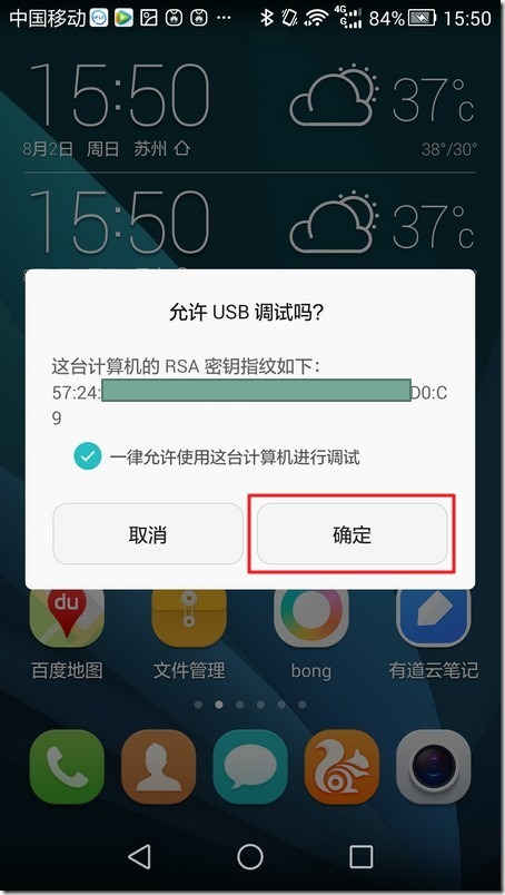 20.而刚才发现,手机上弹出提示,是否运行USB调试,选择确定: