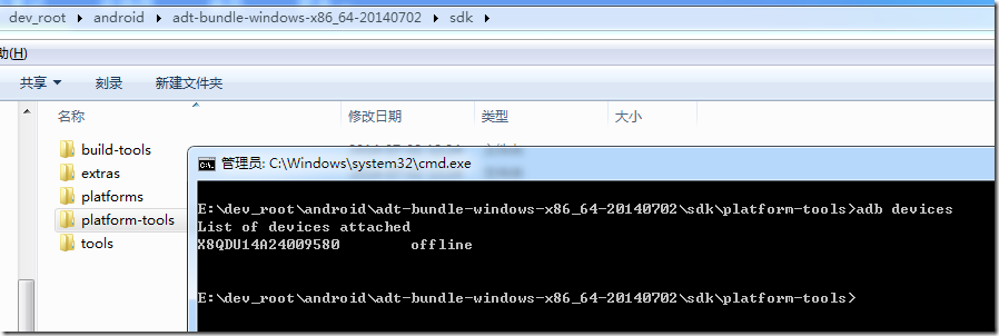 E:\dev_root\android\adt-bundle-windows-x86_64-20140702\sdk\platform-tools>adb devices List of devices attached X8QDU14A24009580 offline E:\dev_root\android\adt-bundle-windows-x86_64-20140702\sdk\platform-tools>adb devices List of devices attached X8QDU14A24009580 device