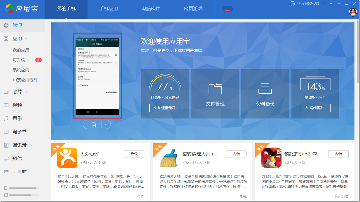 此手机插入电脑时,是可以被其他软件,比如应用宝检测到的: