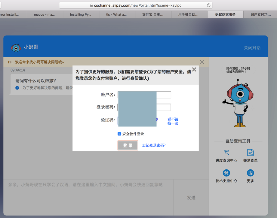 1. 你好 我无法登入支付宝 q