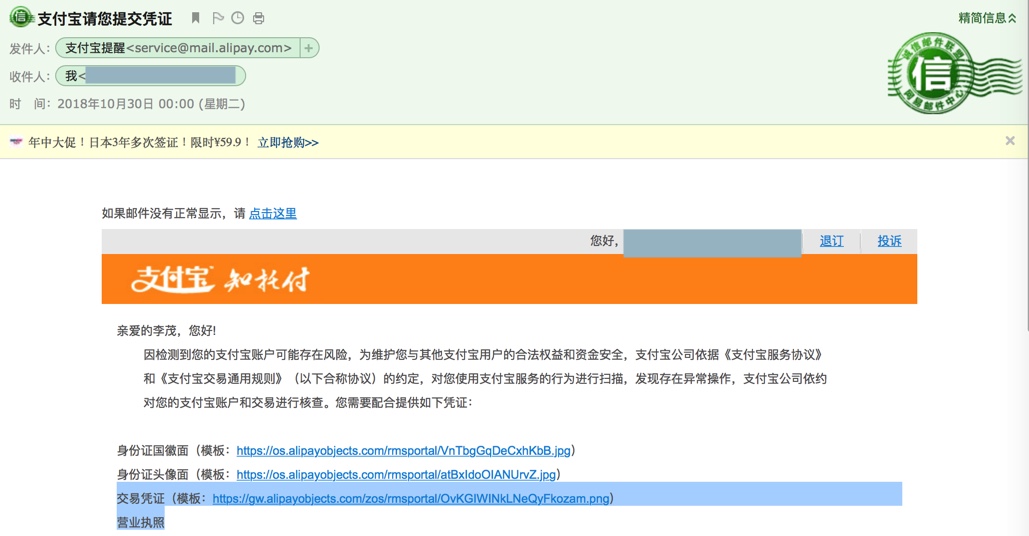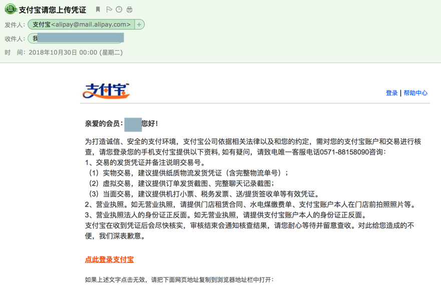 为打造诚信、安全的支付环境,支付宝公司依据相关法律以及和您的约定,需对您的支付宝账户和交易进行核查,请您登录您的手机支付宝提供以下资料, 如有疑问,请致电唯一客服电话0571-88158090咨询: