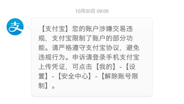 【支付宝】您的账户涉嫌交易违规,支付宝限制了账户的部分功能。请严格遵守支付宝协议,避免违规行为。申诉请登录手机支付宝上传凭证,可点击【我的】-【设置】-【安全中心】-【解除账号限制】。