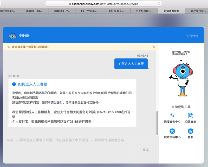 打支付宝的商家客服,或者其他客服系统-》始终都找不到 人工服务,有的也只是提醒我去手机端操作