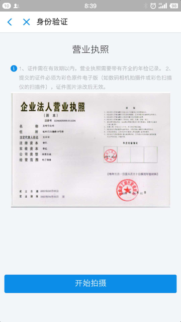 2、营业执照。如无营业执照,请提供门店租赁合同、水电煤缴费单、支付宝账户本人在门店前拍照照片等。