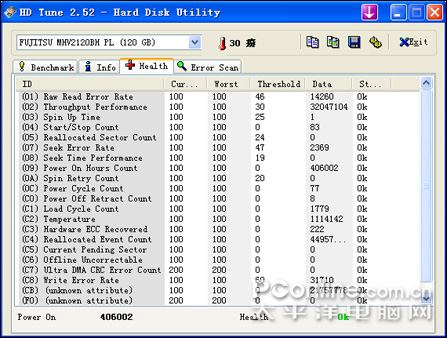 点击Health,下方的Power On就是之前提到的硬盘通电时间,以笔者的为例,时间为406002。不过请注意,不同厂商的硬盘计量单位不同,比较常见的都是以小时为计量单位,但也有少数厂商的硬盘是以分钟乃至秒为计量单位,例如笔者的富士通硬盘,其就是以秒为单位,也就是说笔者的硬盘已经总计通电406002秒。