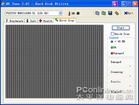 点击Error Scan,这里是检测硬盘的坏道等情况,点击Scan就可以了,不过需要耗费很长的时间,通常我们建议勾选Quick Scan,在购本时这种快速检测也完全足够了。