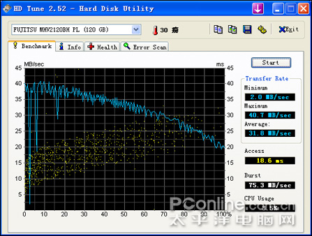 对硬盘性能感兴趣的用户,也可以点选Benchmark,对硬盘的性能进行检测。不到一分钟后,软件就会显示出硬盘的得分情况,以笔者的为例,最大数据传输速率为40.7MB/s,平均为31.8MB/s,响应时间为18.6ms,突发数据传输率为75.3MB/s,处理器资源占有率为3.5%。