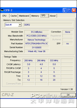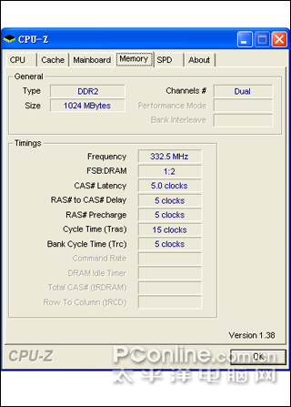 点击Memory,我们可以察看内存的信息,类型为DDR2,总计1024MB,而Channels则显示内存的双通道状态,Dual为双通道,Single则只是单通道。