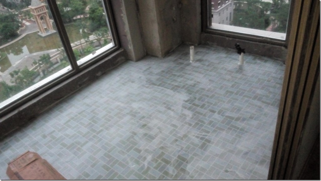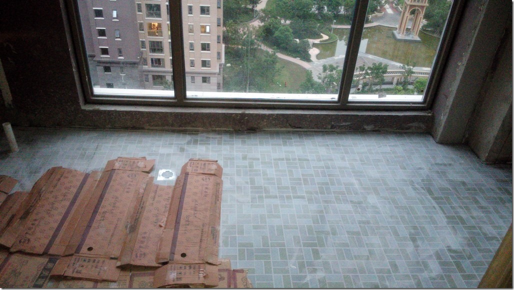 阳台的金科陶瓷的300×300的绿色小方砖,已经铺完:从铺砖师傅那里得知,那个砖的质量,真心是不好->很多片中间都是鼓了,砖都不平->也难怪很便宜,300×300的一片才2.5元,一平才2.5×11=27.5元的。。。