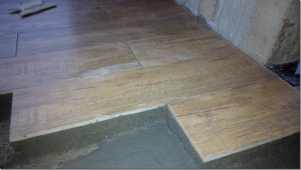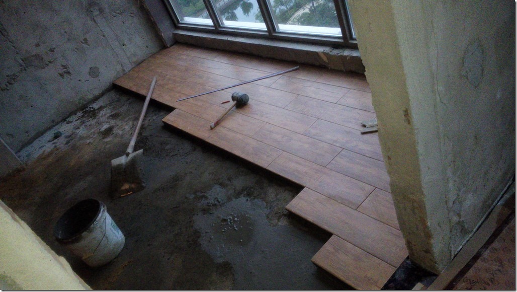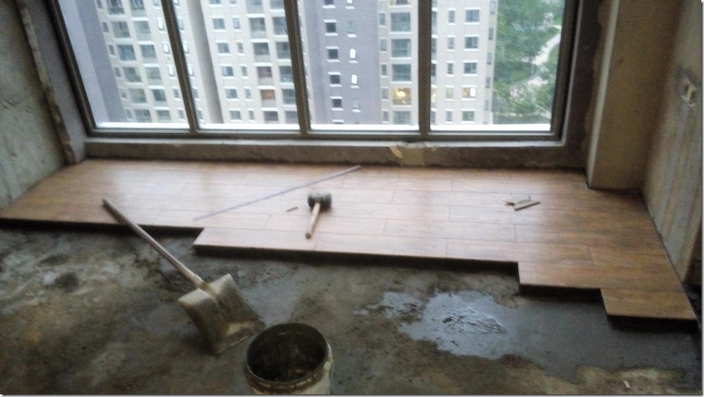 客厅的,罗玛安特的木纹砖,开始铺了,只铺了客厅南面一点点。