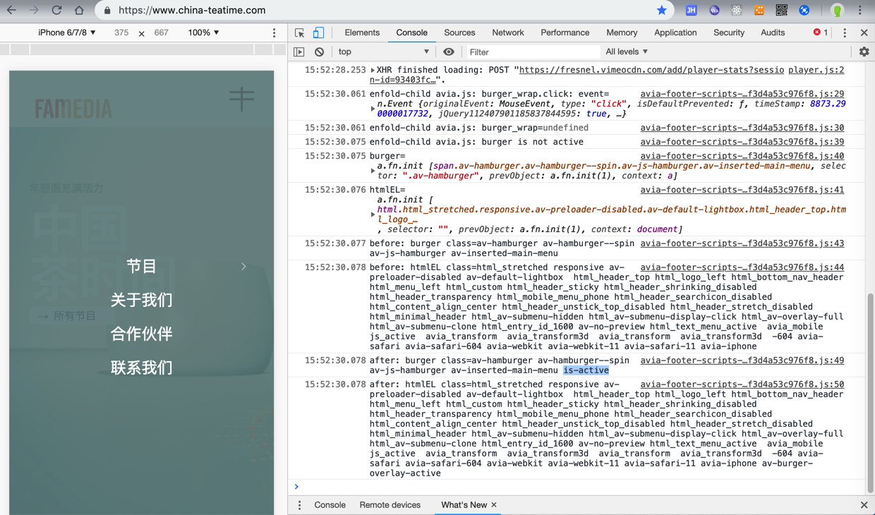 ;s=t('.av-burger-menu-main a')}());s.click(function(a){中的s,可能由于变量作用域的关系,被压缩后,变量名错了,被前面的s覆盖了。