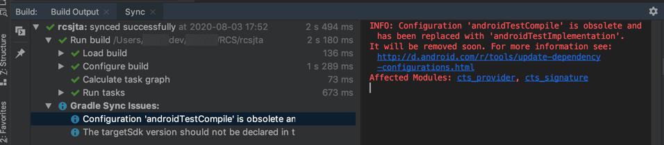 INFO: Configuration 'androidTestCompile' is obsolete and has been replaced with 'androidTestImplementation'. It will be removed soon. For more information see: http://d.android.com/r/tools/update-dependency-configurations.html Affected Modules: cts_provider, cts_signature