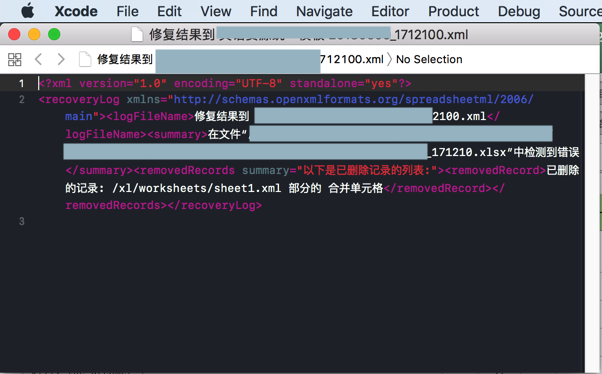 <recoveryLog xmlns="http://schemas.openxmlformats.org/spreadsheetml/2006/main"><logFileName>修复结果到 xxx2100.xml</logFileName><summary>在文件“/Users/xxx210.xlsx”中检测到错误</summary><removedRecords summary="以下是已删除记录的列表:"><removedRecord>已删除的记录: /xl/worksheets/sheet1.xml 部分的 合并单元格</removedRecord></removedRecords></recoveryLog>