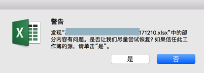 发现 xlsx 中的部分内容有问题。是否让我们尽量尝试恢复? 如果信任此工作簿的源,请单击“是”。