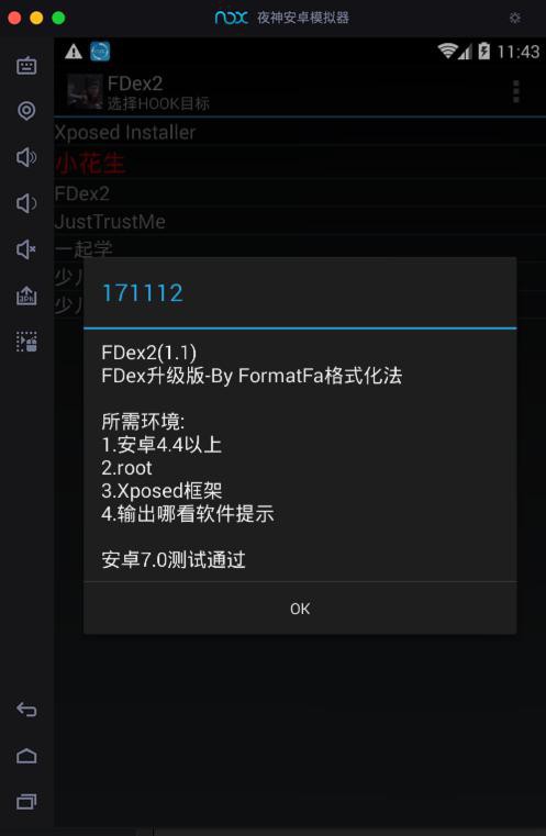 安装到夜神模拟器后,再去启动FDex2,设置hook这个小花生app:
