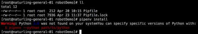 <code>[root@naturling-general-01 robotDemo]# pipenv install Warning: Python 3.6 was not found on your system You can specify specific versions of Python with: $ pipenv --python path/to/python </code>