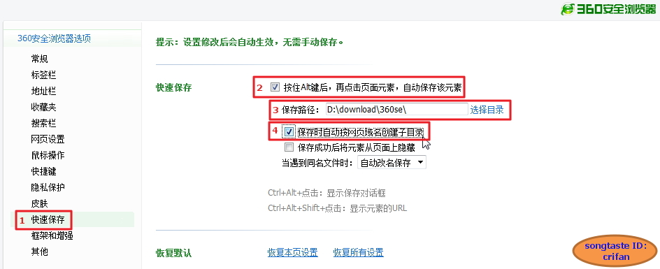 360浏览器 -> 工具 -> 选项 -> 快速保存 ->