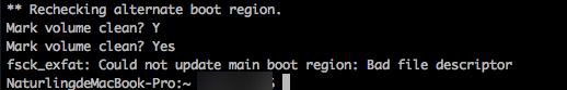 Mark volume clean? Y Mark volume clean? Yes fsck_exfat: Could not update main boot region: Bad file descriptor