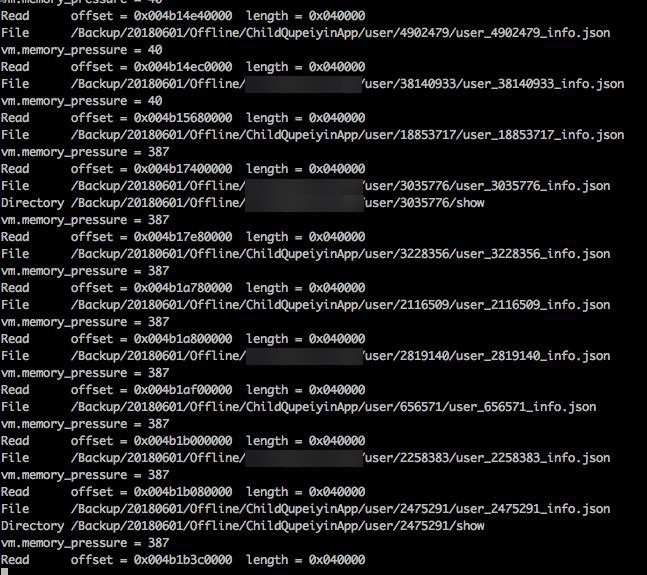 /Backup/20180601/Offline/xxx/user/31365865/user_31365865_info.json Read offset = 0x004855ec0000 length = 0x040000 File /Backup/20180601/Offline/xxx/user/31442047/user_31442047_info.json ... File /Backup/20180601/Offline/xxx/user/32054152/user_32054152_info.json Directory /Backup/20180601/Offline/xxx/user/32054152/show Read offset = 0x004871c40000 length = 0x040000 File /Backup/20180601/Offline/xxx/user/38407978/user_38407978_info.json