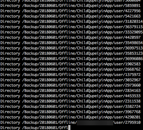 ... Directory /Backup/20180601/Offline/xxx/user/36752158 Directory /Backup/20180601/Offline/xxx/user/31190871 Directory /Backup/20180601/Offline/xxx/user/5340798 ...