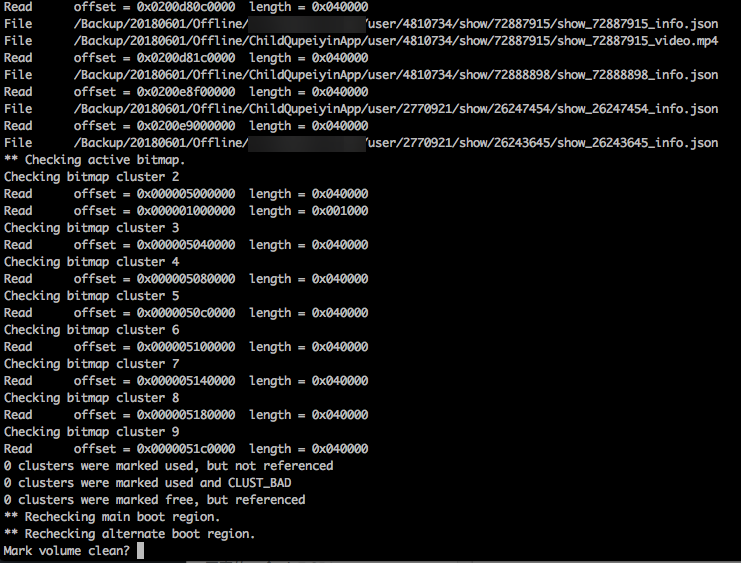Read offset = 0x0200e8f00000 length = 0x040000 File /Backup/20180601/Offline/xxx/user/2770921/show/26247454/show_26247454_info.json Read offset = 0x0200e9000000 length = 0x040000 File /Backup/20180601/Offline/xxx/user/2770921/show/26243645/show_26243645_info.json ** Checking active bitmap. Checking bitmap cluster 2 Read offset = 0x000005000000 length = 0x040000 Read offset = 0x000001000000 length = 0x001000 Checking bitmap cluster 3 Read offset = 0x000005040000 length = 0x040000 Checking bitmap cluster 4 Read offset = 0x000005080000 length = 0x040000 Checking bitmap cluster 5 Read offset = 0x0000050c0000 length = 0x040000 Checking bitmap cluster 6 Read offset = 0x000005100000 length = 0x040000 Checking bitmap cluster 7 Read offset = 0x000005140000 length = 0x040000 Checking bitmap cluster 8 Read offset = 0x000005180000 length = 0x040000 Checking bitmap cluster 9 Read offset = 0x0000051c0000 length = 0x040000 0 clusters were marked used, but not referenced 0 clusters were marked used and CLUST_BAD 0 clusters were marked free, but referenced ** Rechecking main boot region. ** Rechecking alternate boot region. Mark volume clean?