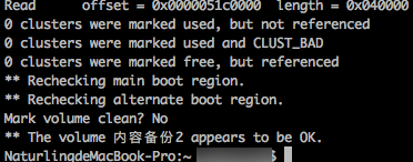 ** Rechecking alternate boot region. Mark volume clean? No ** The volume 内容备份2 appears to be OK.