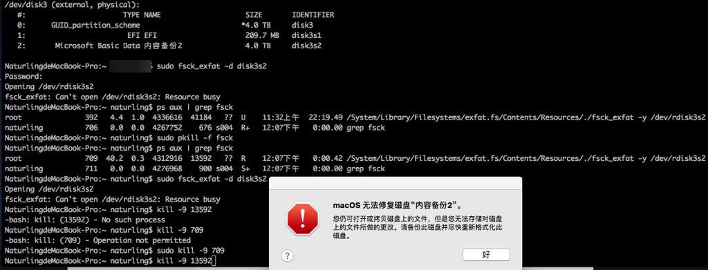 xxxdeMacBook-Pro:~ xxx$ diskutil list /dev/disk0 (internal, physical): #: TYPE NAME SIZE IDENTIFIER 0: GUID_partition_scheme *240.1 GB disk0 1: EFI EFI 209.7 MB disk0s1 2: Apple_APFS Container disk2 239.9 GB disk0s2 /dev/disk1 (internal, physical): #: TYPE NAME SIZE IDENTIFIER 0: GUID_partition_scheme *320.1 GB disk1 1: EFI EFI 209.7 MB disk1s1 2: Apple_HFS Toshiba 320G 319.2 GB disk1s2 3: Apple_Boot Recovery HD 650.0 MB disk1s3 /dev/disk2 (synthesized): #: TYPE NAME SIZE IDENTIFIER 0: APFS Container Scheme - +239.9 GB disk2 Physical Store disk0s2 1: APFS Volume SandDisk 240G 37.1 GB disk2s1 2: APFS Volume Preboot 22.4 MB disk2s2 3: APFS Volume Recovery 516.1 MB disk2s3 4: APFS Volume VM 2.1 GB disk2s4 /dev/disk3 (external, physical): #: TYPE NAME SIZE IDENTIFIER 0: GUID_partition_scheme *4.0 TB disk3 1: EFI EFI 209.7 MB disk3s1 2: Microsoft Basic Data 内容备份2 4.0 TB disk3s2 xxxdeMacBook-Pro:~ xxx$ sudo fsck_exfat -d disk3s2 Password: Opening /dev/rdisk3s2 fsck_exfat: Can't open /dev/rdisk3s2: Resource busy xxxdeMacBook-Pro:~ xxx$ ps aux | grep fsck root 392 4.4 1.0 4336616 41184 ?? U 11:32上午 22:19.49 /System/Library/Filesystems/exfat.fs/Contents/Resources/./fsck_exfat -y /dev/rdisk3s2 xxx 706 0.0 0.0 4267752 676 s004 R+ 12:07下午 0:00.00 grep fsck xxxdeMacBook-Pro:~ xxx$ sudo pkill -f fsck xxxdeMacBook-Pro:~ xxx$ ps aux | grep fsck root 709 40.2 0.3 4312916 13592 ?? R 12:07下午 0:00.42 /System/Library/Filesystems/exfat.fs/Contents/Resources/./fsck_exfat -y /dev/rdisk3s2 xxx 711 0.0 0.0 4276968 900 s004 S+ 12:07下午 0:00.00 grep fsck xxxdeMacBook-Pro:~ xxx$ sudo fsck_exfat -d disk3s2 Opening /dev/rdisk3s2 fsck_exfat: Can't open /dev/rdisk3s2: Resource busy xxxdeMacBook-Pro:~ xxx$ kill -9 13592 -bash: kill: (13592) - No such process xxxdeMacBook-Pro:~ xxx$ kill -9 709