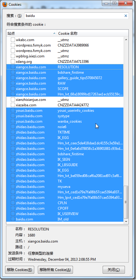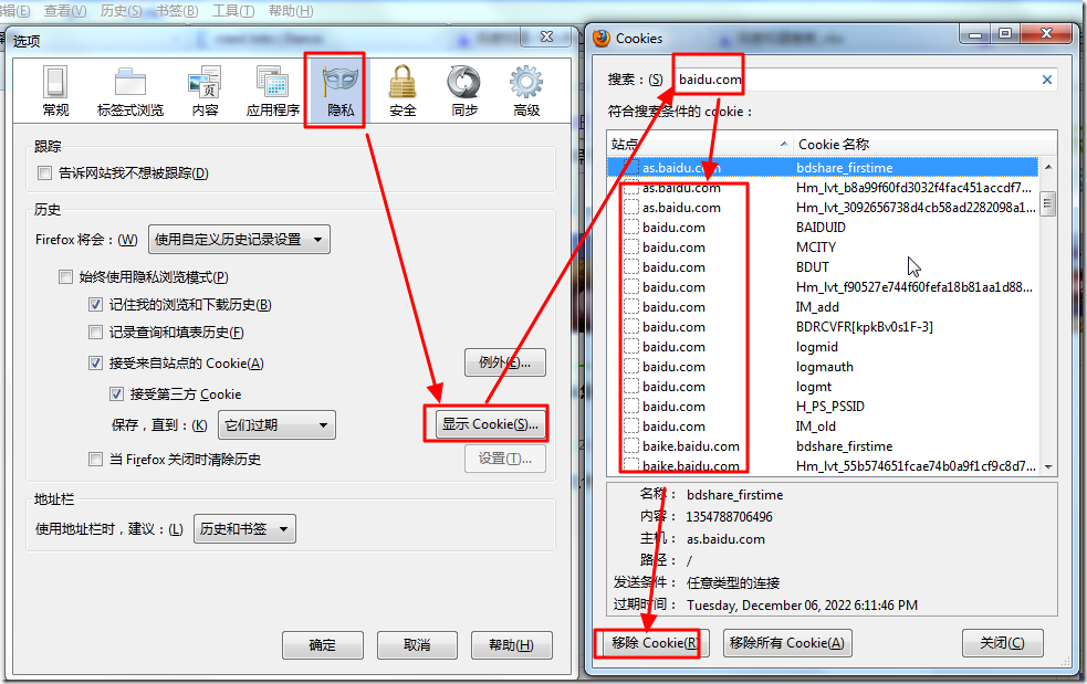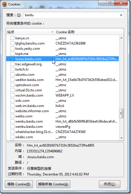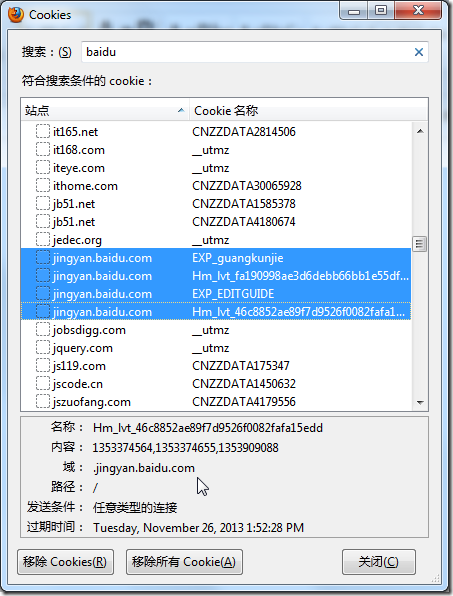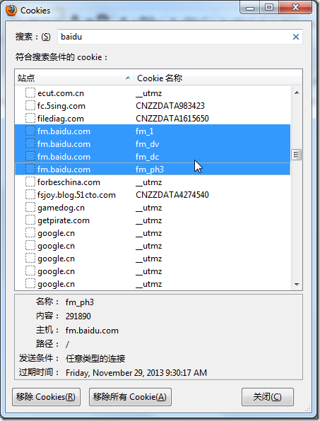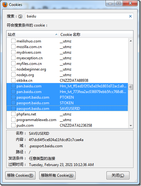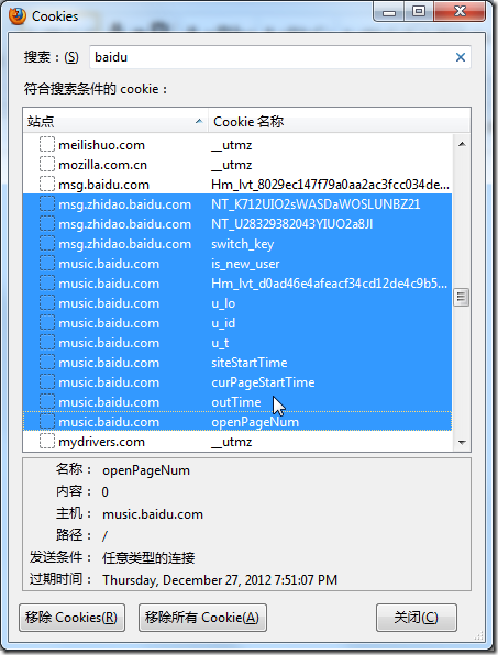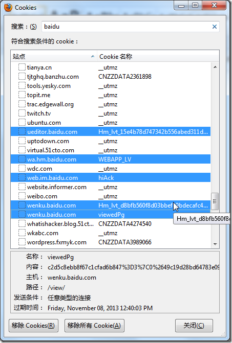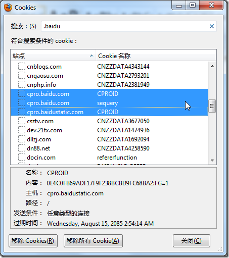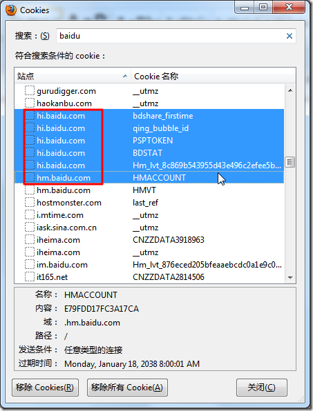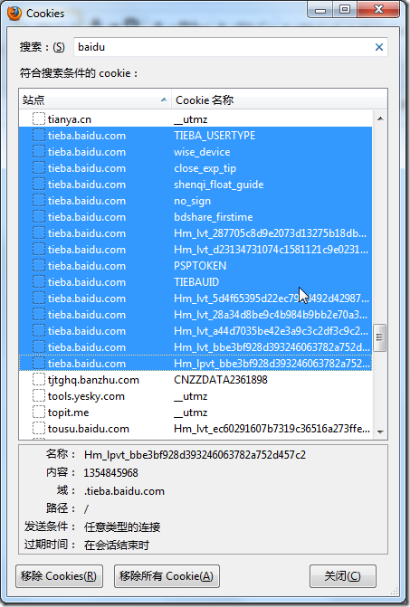 2.自己去Firefox中,清楚一些Baidu相关的cookie:
