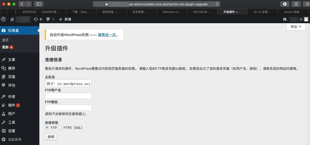 此处新安装的OneinStack环境中,刚装的WordPress去升级插件,结果失败,提示: