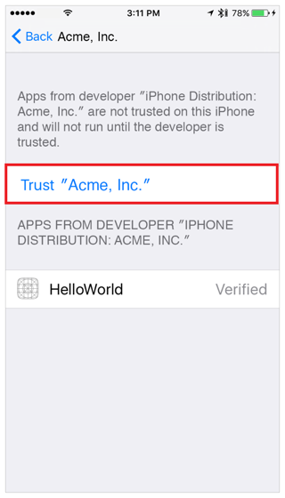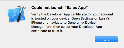 Could not launch “Sales App” Verify the Developer App certificate for your account is trusted on your device. Open Settings on Larry’s iPhone and navigate to General -> Device Management, then select your Developer App certificate to trust it. |